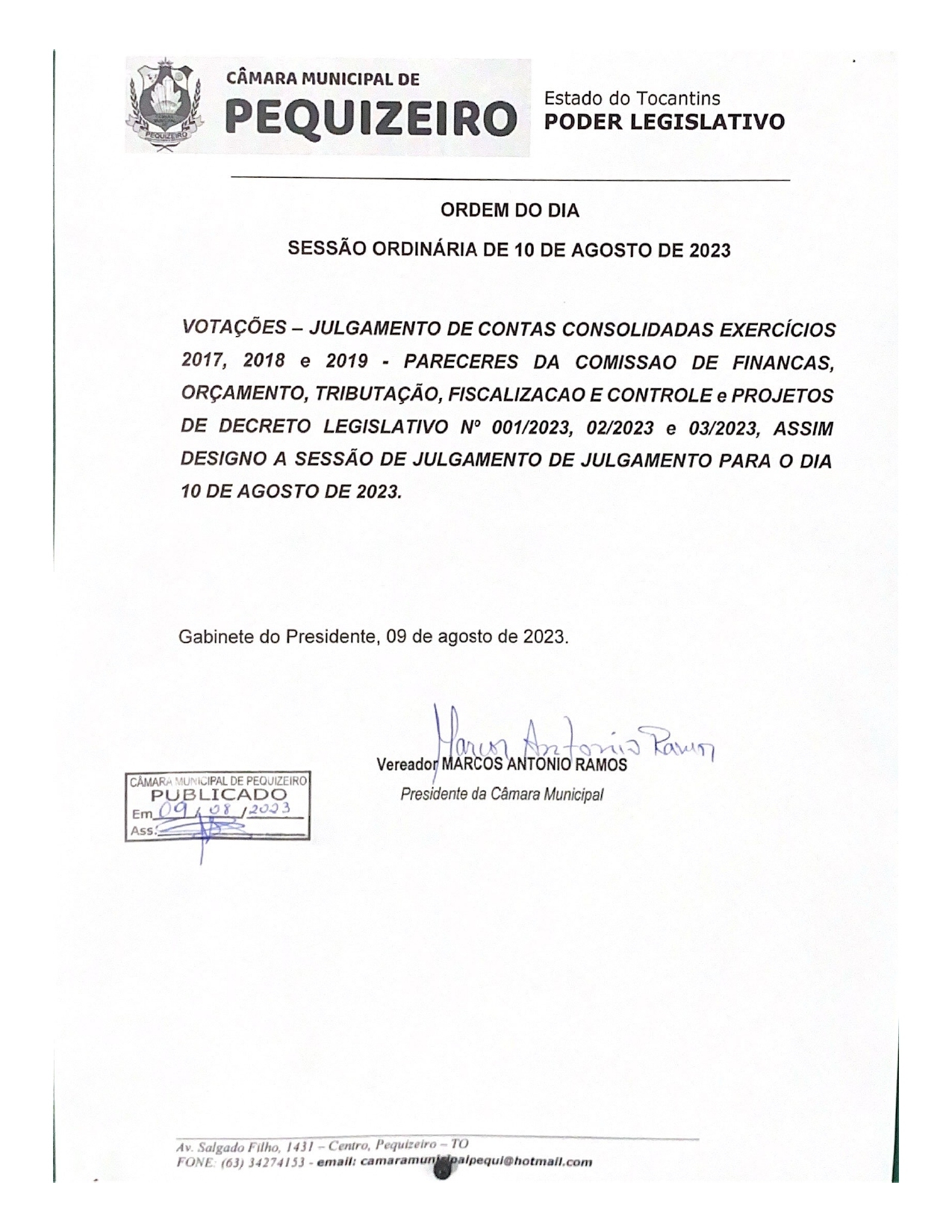 A Câmara Municipal de Pequizeiro, juntamente com o legislativo, convida todos cidadãos a participar da Sessão Ordinária, de julgamento de contas consolidadas exercícios 2017, 2018, 2019, que será realizada às 20 horas do dia 10 de agosto de 2023, no plenário desta Casa de Leis.